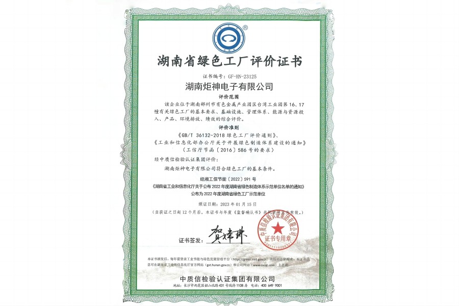 湖南省綠色工廠評(píng)價(jià)證書